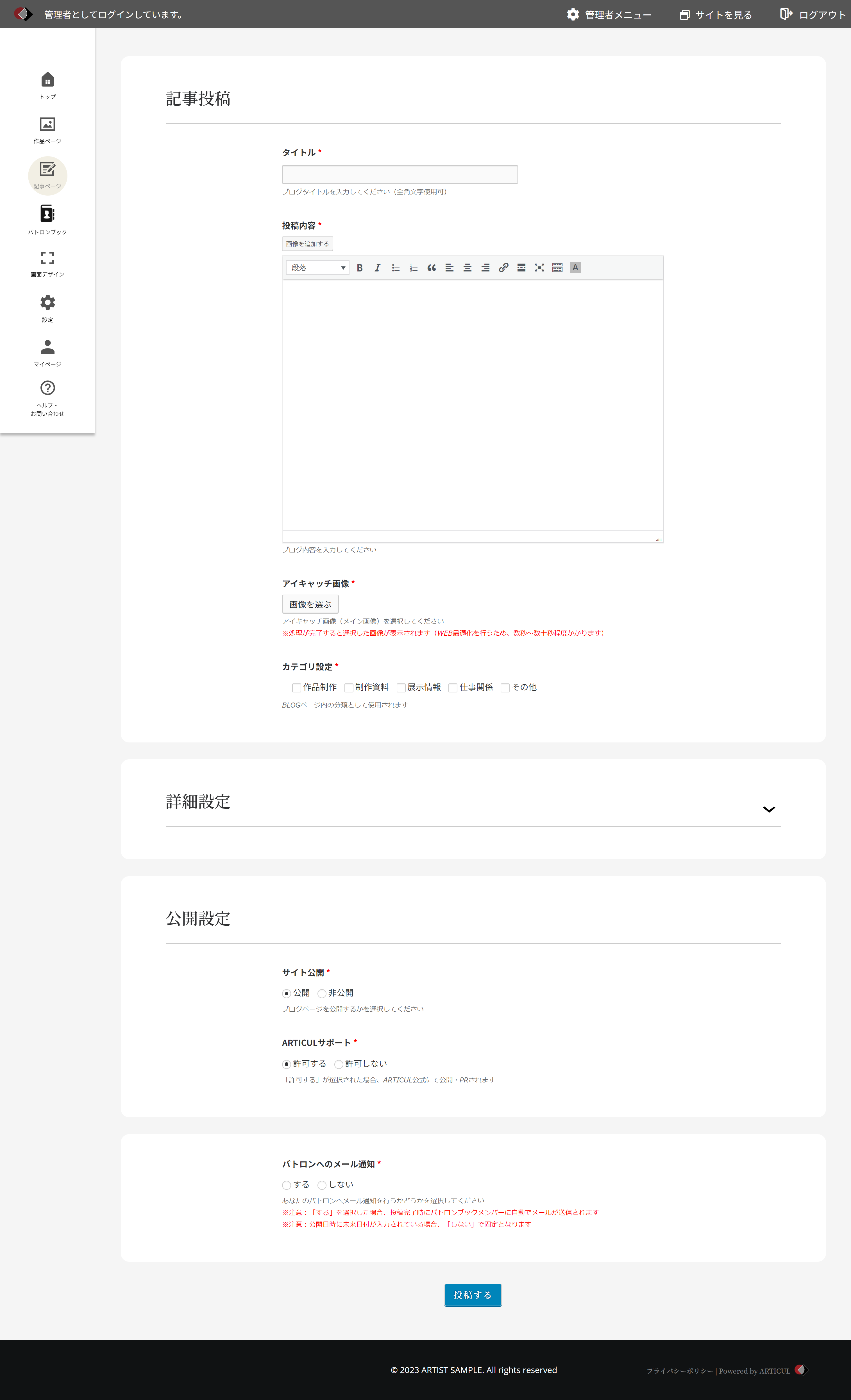 記事に関する設定項目です。各項目の説明は「[\[記事\]記事投稿](https://docs.articul.jp/guide/blog/form/1)」ページからご確認ください。