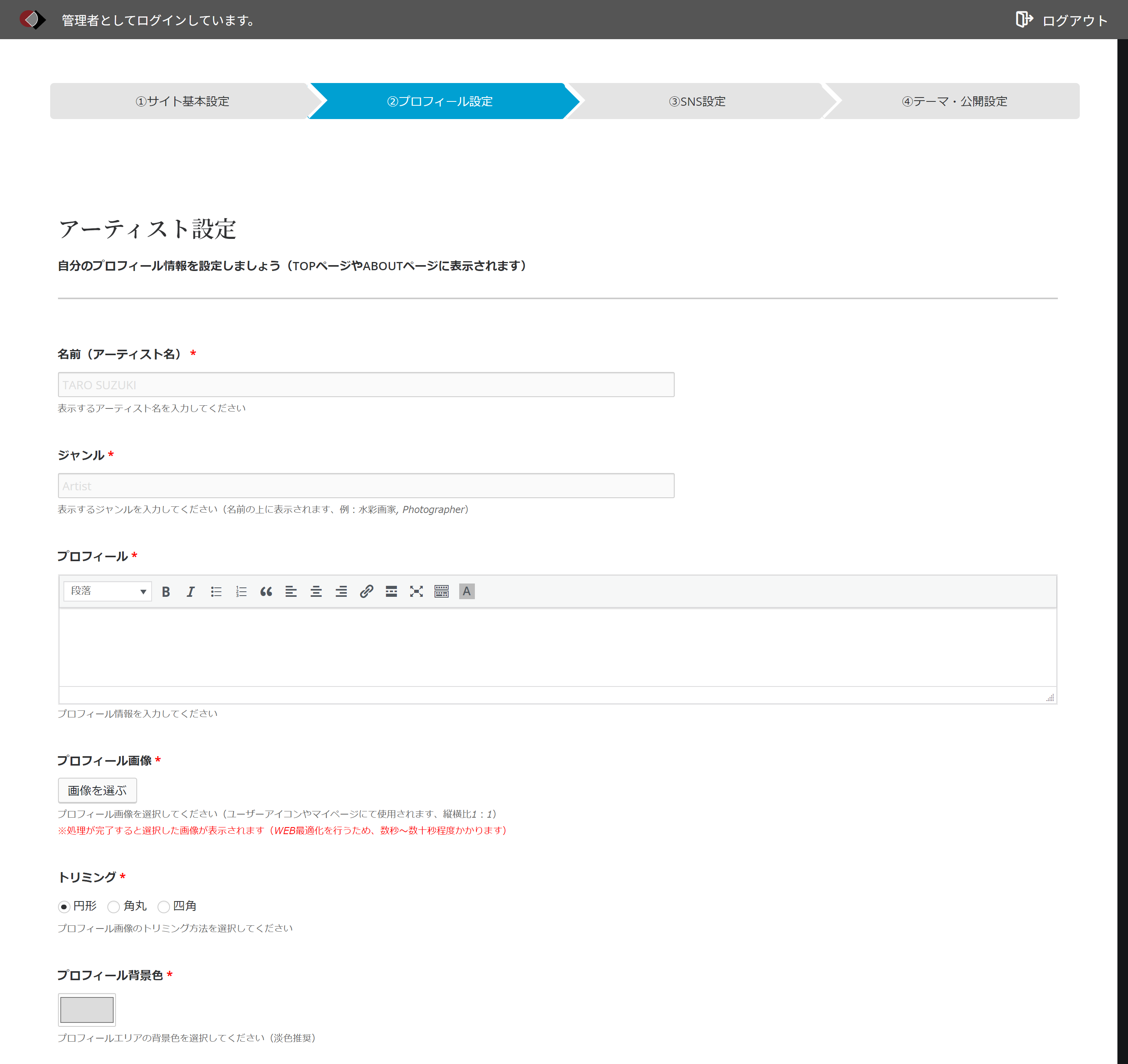 アーティストとしてのジャンルを入力してください。主に名前の上に表示されます。 作家活動に際しての、簡単なコンセプトをご入力いただくことも効果的です。